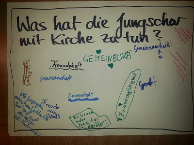 ![]() Die Kinder zu fragen, was sie mit "Jungschar" verbinden, war Teil der ersten Jungscharstunde im Herbst 2017, bei der natürlich auch gespielt wurde. Freilich, der Raum ist für so viele Kinder manchmal fast ein bisschen klein - aber wen stört das schon, wenn's lustig ist oder man/frau sich auf ausgedachten Inseln Gedanken über Jungschar, Gemeinschaft, Kirche und Gott macht. |