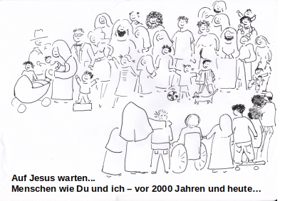 Wie wäre es wohl, wenn sich unter die Menschen, die damals auf Jesus gewartet haben, Leute aus der Bibel "mischen", die wir aus anderen Bibelerzählungen kennen? Schau einmal, dazu lädt das Bild (hier zum Ausmalen) ein und: