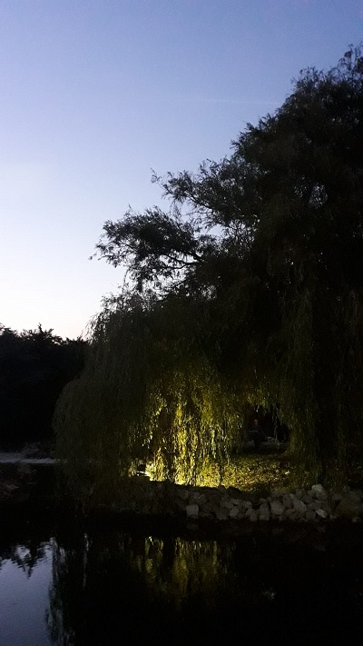 Wir fuhren ein Stück weiter nach Großhöflein, das bekannt ist für zahlreiche Winzer, gute Weine und wunderschöne Plätze in der Natur. Unser Priester-Seelsorger Fabian Mmagu war hier 5 Jahre tätig. Deshalb begrüßte uns Frau Krizan vom PGR mit besonderer Freude und führte uns in ihr historisches Badhaus, die Radigundiskapelle mit der Schwefel-Heilquelle und das anschließende denkmalgeschützte Pleiningerhaus mit schönen Fresken. Natürlich machten wir einen Sprung in die Pfarrkirche, bevor wir uns beim Florianiheurigen stärkten und die weite Aussicht genossen. Die untergehende Sonne führte uns zum Abschluss in die nahe gelegene „Arche-Moorhof“. Wir bestaunten die kunstvollen Kreuzweg-Stationen am „Lichtweg“. Am Feuer entzündeten wir alle unsere Fackeln und beendeten den Abend mit einer kleinen liturgischen Geschichte in der Grotte.